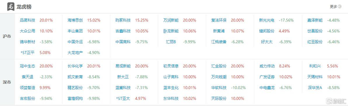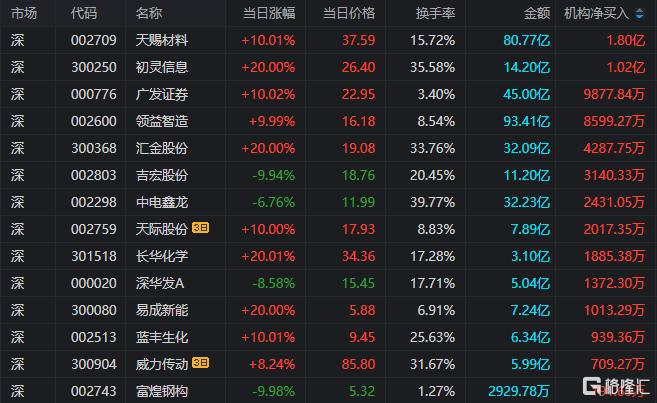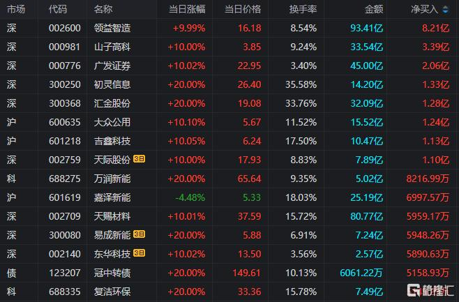 龙虎榜单日净买入额前三为领益智造、山子高科、广发证券,分别为8.21亿元、3.39亿元、2.06亿元。
