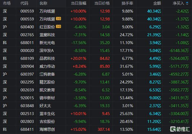 龙虎榜单日净卖出额前三为万向钱潮、蓝黛科技、新华发A,分别为2.42亿元、1.14亿元、6148.36万元。