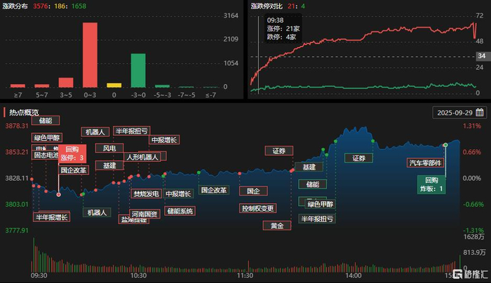 9月29日,沪指涨0.9%报3862点,深证成指涨2.05%,创业板指涨2.74%。全市场成交额2.18万亿元,超3500股上涨。市场热点聚焦证券、电池、氟化工、贵金属、黄金板块板块。