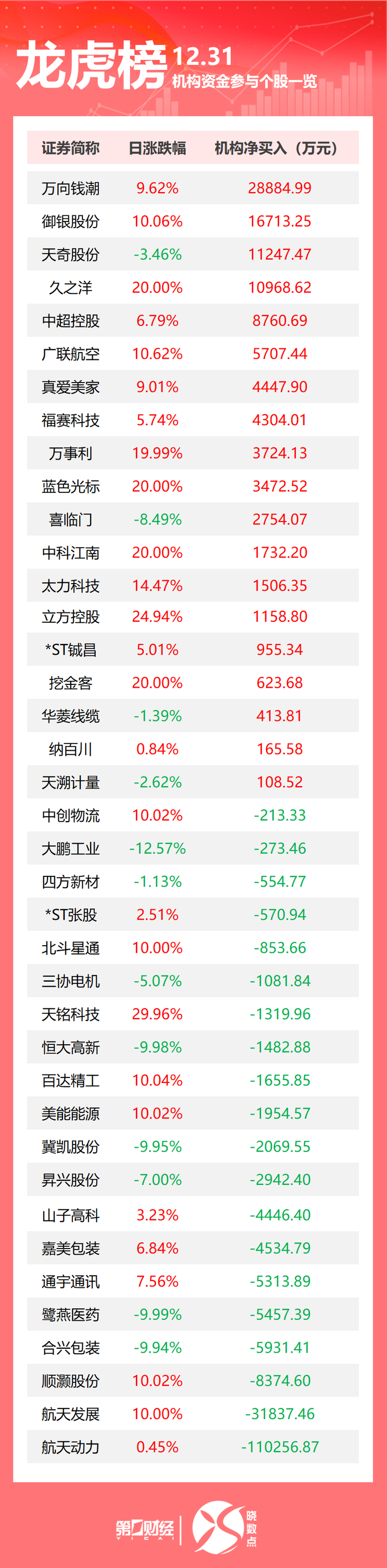 龙虎榜丨机构今日抛售这20股,买入万向钱潮2.89亿元
