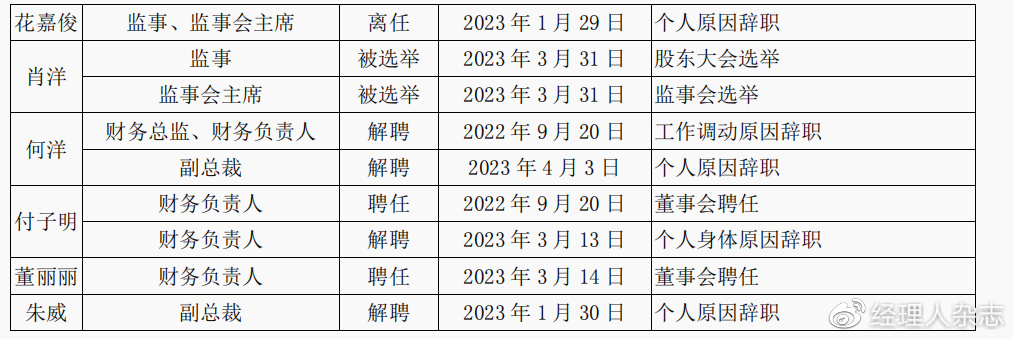 除此之外,花嘉俊2023年1月29日申请辞去职工代表监事及监事会主席职务,其辞职后仍担任公司金融运营中心副总经理职务。1月30日,公司的副总裁朱威离职,其辞职后不在公司及控股子公司担任任何职务。