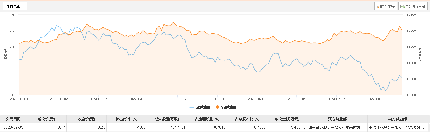 9月5日大宗交易成交1711.51万股,成交额5425.47万元,占当日总成交额的6.9%,成交价3.17元,较市场收盘价3.23元折价1.86%。