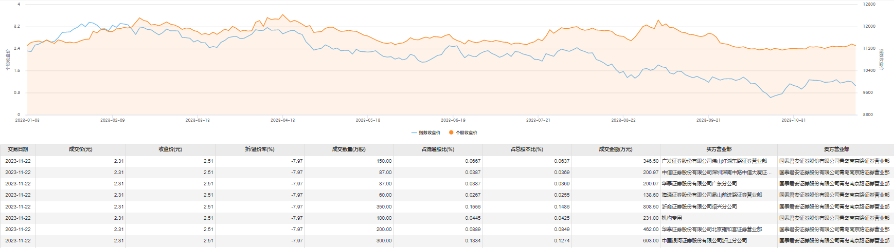 今日大宗交易成交1334万股,成交额3081.54万元,占当日总成交额的12.49%,成交价2.31元,较市场收盘价折价7.97%。