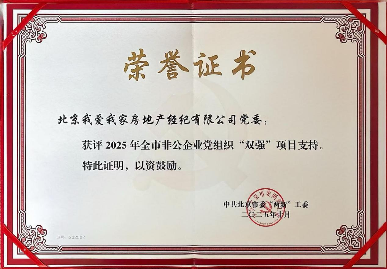 近日,我爱我家集团党建品牌“爱家星行动”入选2025年北京市非公有制企业党组织“党建强、发展强”项目支持名单,该项目由北京市委“两新”工委组织,是全市非公企业党建工作先进典型选树的重要平台。凭借着党建引领企业发展、赋能基层治理、践行社会责任等方面的扎实实践与突出成效,我爱我家成为今年唯一入选“双强”项目的房地产经纪企业。