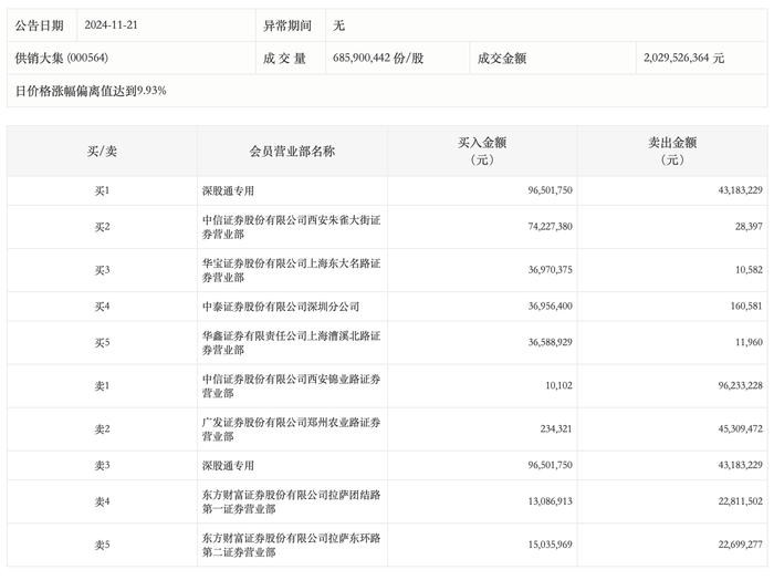 11月21日,供销大集今日涨停,龙虎榜数据显示,上榜营业部席位全天成交5.4亿元,占当日总成交金额比例为26.61%。其中,买入金额为3.1亿元,卖出金额为2.3亿元,合计净买入7916.39万元。