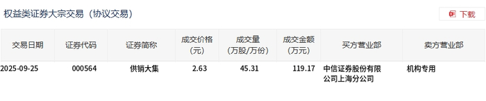 供销大集今日大宗交易平价成交45.31万股,成交额119.17万元