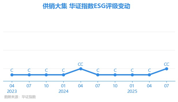 日前,华证指数公布了新一期(2025年7月31日)的ESG评级结果,供销大集(000564.SZ)获得CC评级(华证指数评级为C起至AAA九档,C为最低档,AAA为其最高一级评级/AA为其第二档),上一期(2025年4月30日)ESG评级为C。本期ESG评级在39家多品类零售行业A股上市公司中排名第31(上一期排名第35)。