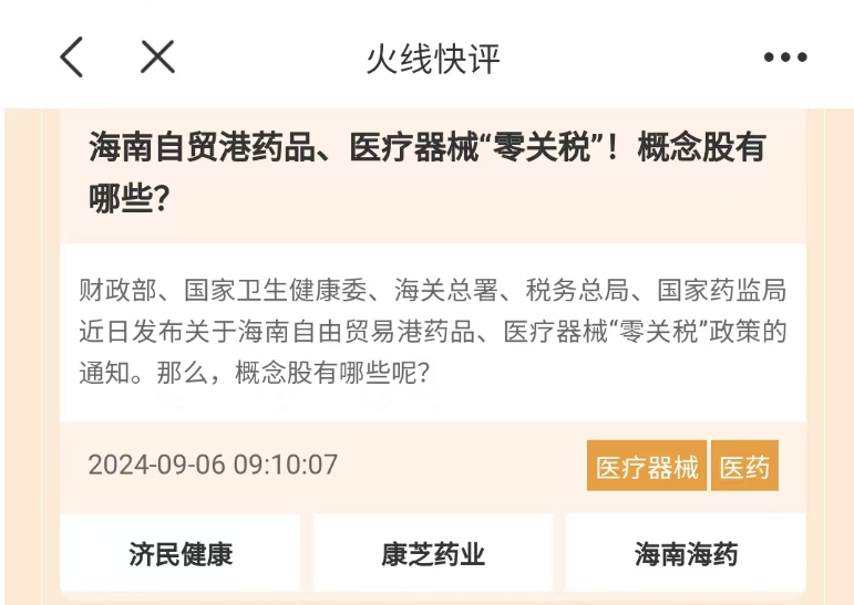 在每日经济新闻APP私人订制的“火线快评”中,9月6日(上周五)提到了海南医药板块,相关个股海南海药这几天连续涨停。