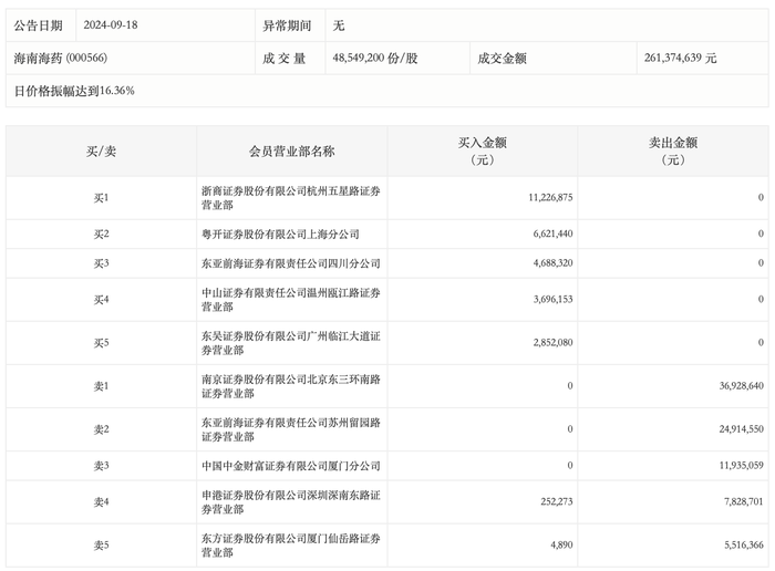 9月18日,海南海药今日跌停,龙虎榜数据显示,上榜营业部席位全天成交1.16亿元,占当日总成交金额比例为44.56%。其中,买入金额为2934.2万元,卖出金额为8712.33万元,合计净卖出5778.13万元。