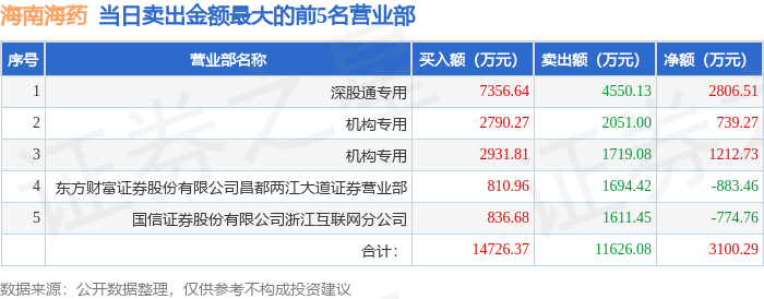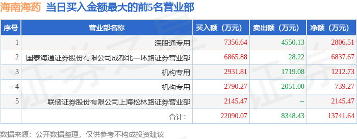 11月20日海南海药(000566)龙虎榜数据:游资上海松林路上榜