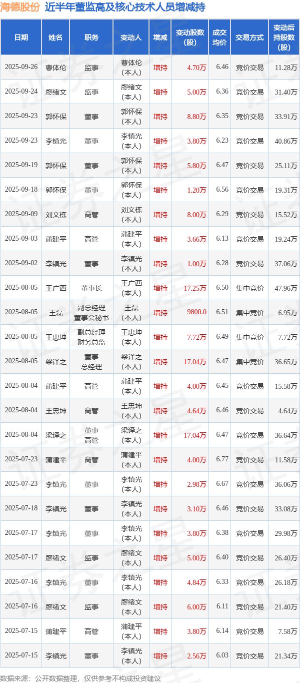 海德股份近半年内的董监高及核心技术人员增减持详情如下: