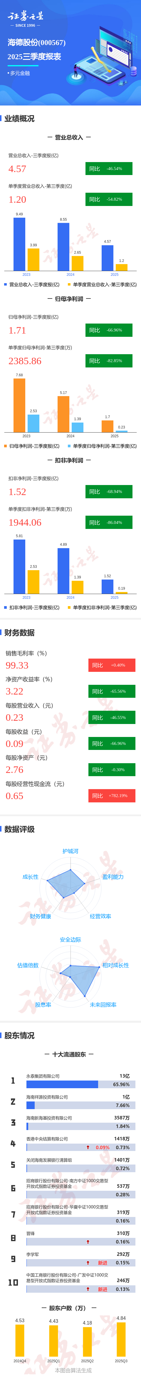 图解海德股份三季报:第三季度单季净利润同比下降82.86%