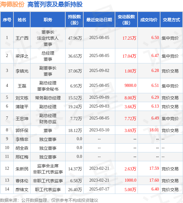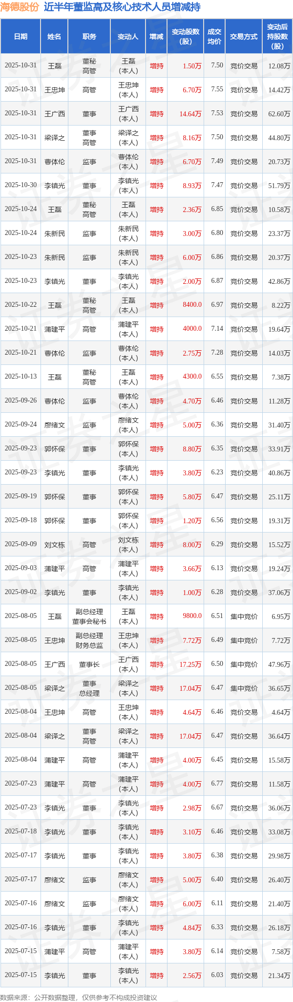 海德股份近半年内的董监高及核心技术人员增减持详情如下:
