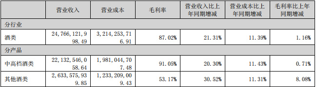 以泸州老窖为例,2022年,酒类产品毛利率达到了87.02%,提升了1.16个百分点,旗下中高档酒类产品毛利率高达91.05%,继续提升0.71个百分点,其他酒类产品毛利率达到了53.17%,增长了8.08个百分点。