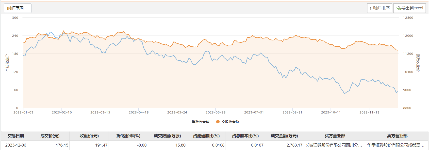 今日大宗交易成交15.8万股,成交额2783.17万元,占当日总成交额的2.31%,成交价176.15元,较市场收盘价折价8.0%。