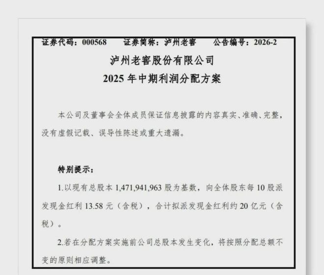 1月9日晚,千亿白酒龙头泸州老窖抛出20亿元中期分红方案,以每10股派13.58元的真金白银,为股东送上“新年红包”。在白酒行业深度调整、消费复苏承压的背景下,这笔分红不仅是对高分红承诺的例行兑现,更折射出龙头酒企穿越周期的现金底气与绑定股东的长期战略。