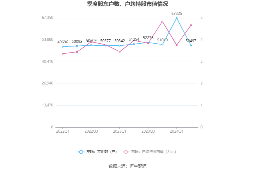 筹码集中度方面,截至2024年上半年末,公司股东总户数为5.05万户,较一季度末下降了1.68万户,降幅25.00%;户均持股市值由一季度末的3.76万元上升至4.67万元,增幅为24.20%。