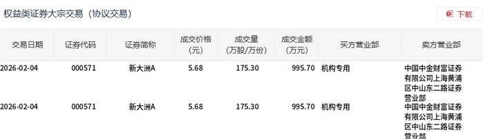 2月4日,新大洲A大宗交易成交350.6万股,成交额1991.4万元,占当日总成交额的9.21%,成交价5.68元,较市场收盘价6.44元折价11.8%。