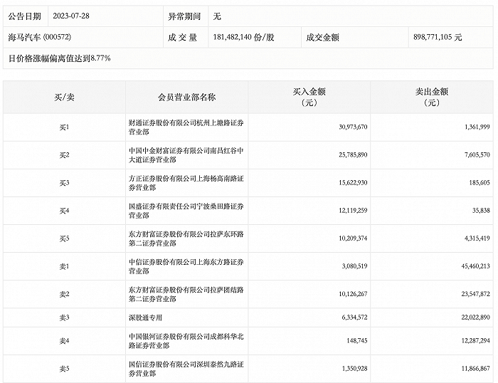 7月28日,海马汽车今日涨停,龙虎榜数据显示,上榜营业部席位全天成交2.44亿元,占当日总成交金额比例为27.2%。其中,买入金额为1.16亿元,卖出金额为1.29亿元,合计净卖出1293.74万元。