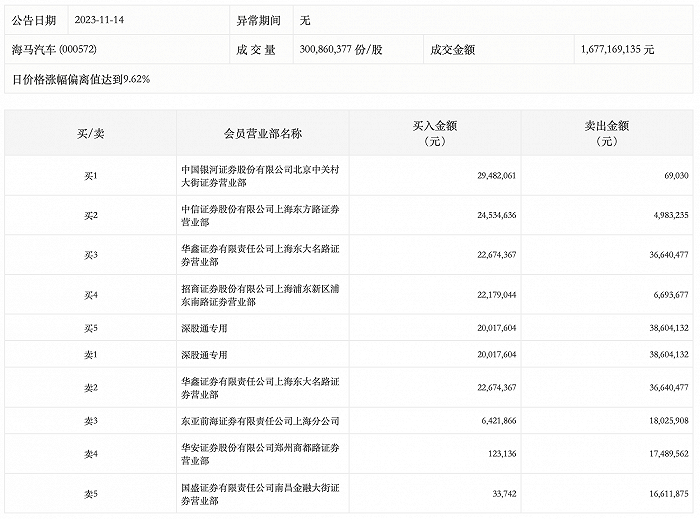 11月14日,海马汽车今日涨停,全天换手率达18.32%,振幅达13.7%。龙虎榜数据显示,营业部席位合计净卖出1365.14万元。其中,中国银河证券北京中关村大街证券营业部、中信证券上海东方路证券营业部分别买入2948.21万元、2453.46万元;深股通专用、华鑫证券上海东大名路证券营业部分别卖出3860.41万元、3664.05万元。