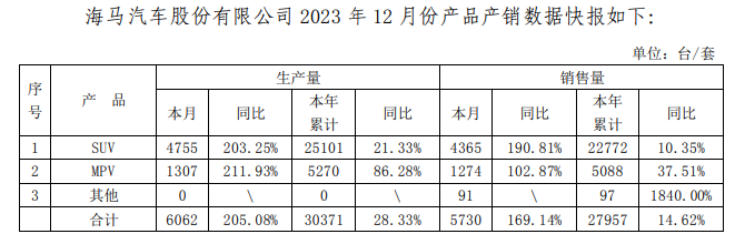 海马汽车:2023年产品(含SUV、MPV及其他)累计销量27957台/套,同比增长14.62%