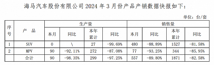 4月15日公告,2024年3月销售量合计557辆,同比减少89.80%;第一季度销售量合计1871辆,同比减少82.58%。