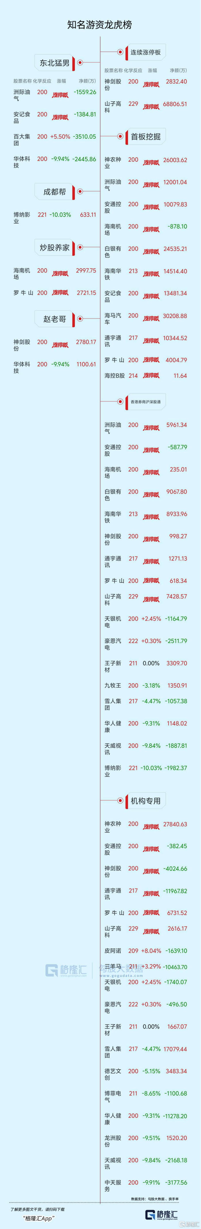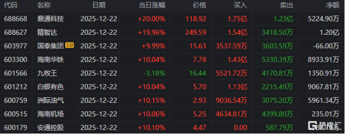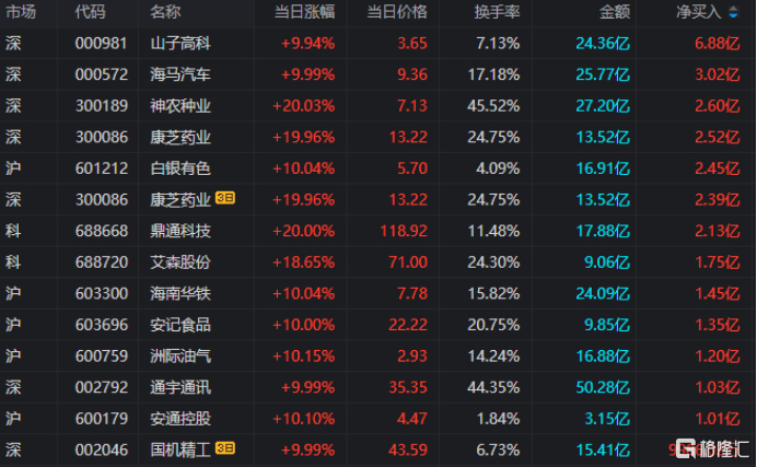 龙虎榜单日净买入额前三为山子高科、海马汽车、神农种业,分别为6.88亿、3.02亿、2.60亿。
