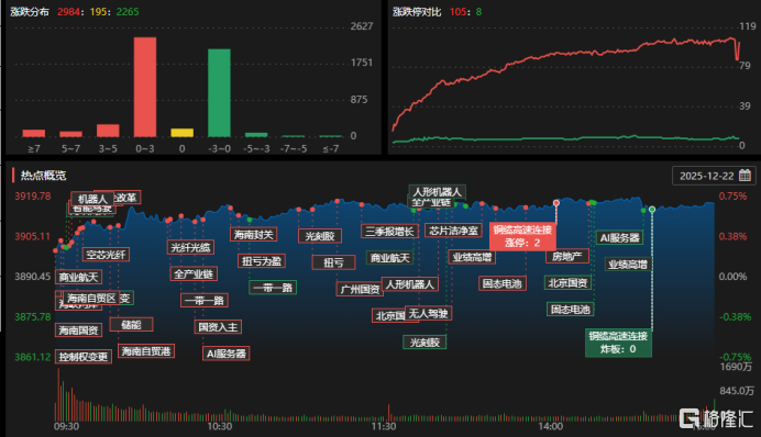 12月22日,沪指涨0.69%报3917点。海南板块大爆发,免税概念走强;SPD概念走低,谷子经济及银行等板块跌幅居前。