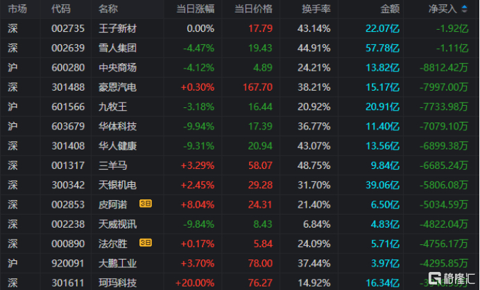 龙虎榜单日净卖出额前三为王子新材、雪人集团、中央商场,分别为1.92亿、1.11亿、8812.42万。