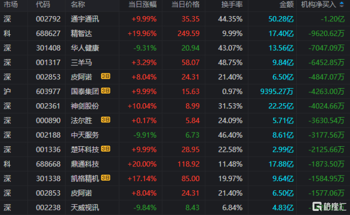 龙虎榜中涉及机构专用席位的个股中,单日净卖出额前三为通宇通讯、精智达、华人健康,分别为1.20亿、9620.62万、7047.09万。