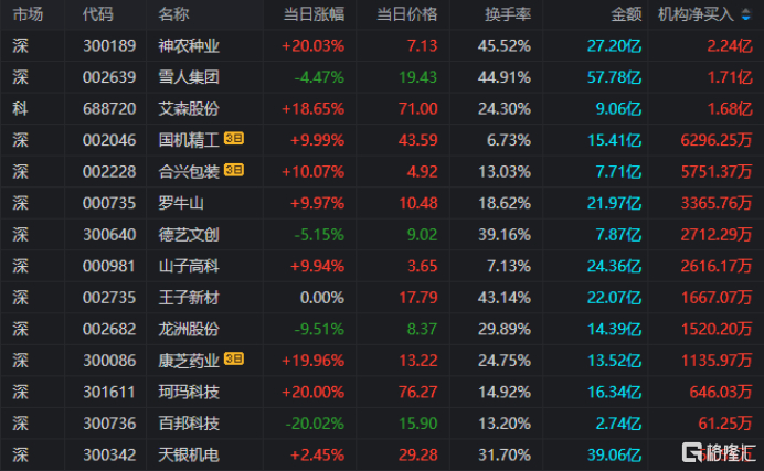 龙虎榜中涉及机构专用席位的个股中,单日净买入额前三为神农种业、雪人集团、艾森股份,分别为2.24亿、1.71亿、1.68亿。