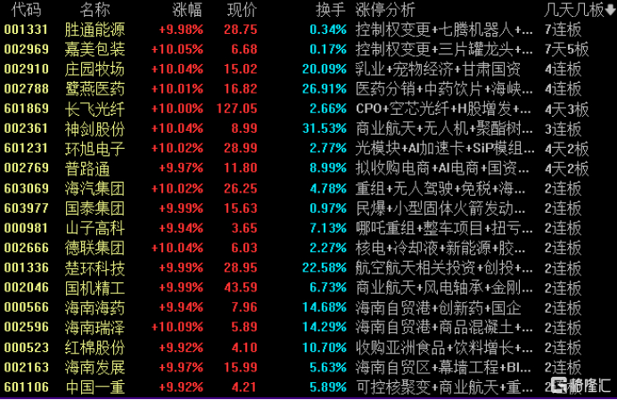 胜通能源7连板,嘉美包装7天5板,庄园牧场、鹭燕医药4连板,长飞光纤4天3板,神剑股份3连板,环旭电子、普路通4天2板,海汽集团、国泰集团、山子高科等2连板。
