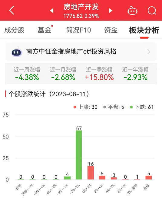中国经济网北京8月11日讯 今日,房地产开发板块整体涨幅0.39%,其中,30只股票上涨,5只股票平盘,61只股票下跌。