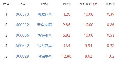 其中,粤宏远A、天房发展、深振业A、光大嘉宝、深深房A位列板块涨幅前五位,涨幅分别为10.08%、10.00%、10.00%、9.94%、8.62%。