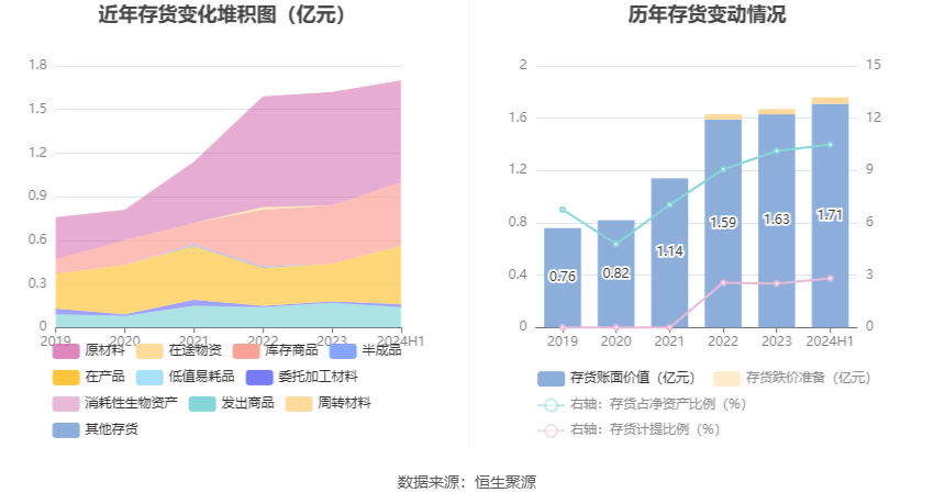 从存货变动来看,截至2024年上半年末,公司存货账面价值为1.71亿元,占净资产的10.48%,较上年末增加759.77万元。其中,存货跌价准备为493.25万元,计提比例为2.81%。