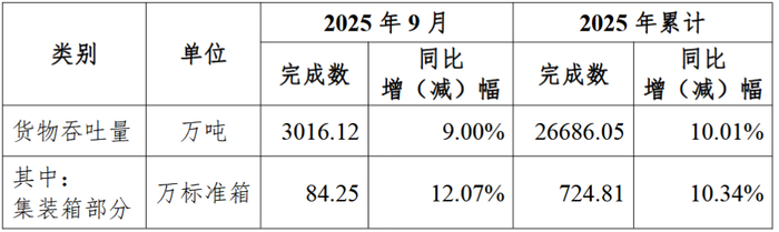 10月10日,北部湾港(000582)发布公告,公司2025年9月完成货物吞吐量3016万吨,同比增长9%,2025年累计完成货物吞吐量2.67亿吨,同比增长10.01%,具体数据如下: