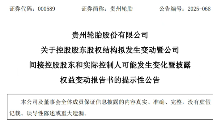 12月16日,国内轮胎行业迎来一则重磅消息,贵州轮胎(000589.SZ)发布公告,宣告其控股股东股权将发生重大变动,这一变动将使公司实际控制人层级上移,开启“省管”新篇章。