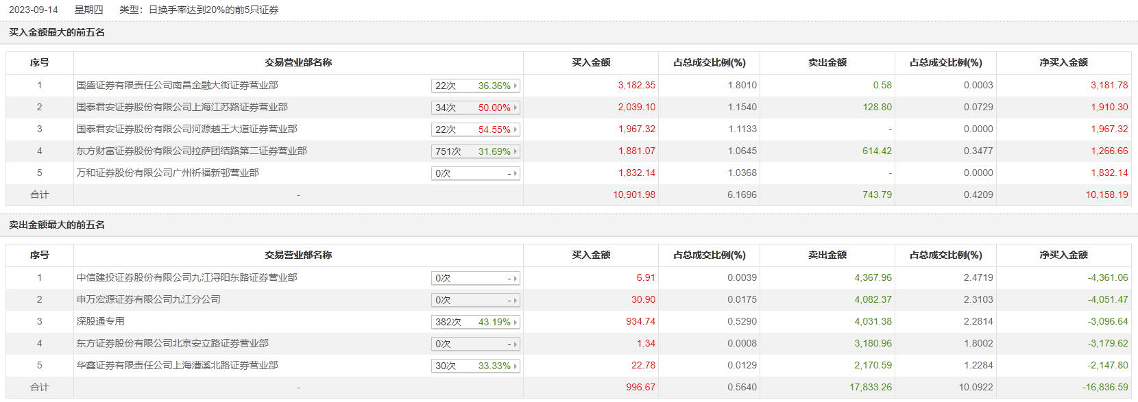 具体来看,知名游资现身龙虎榜,国盛证券南昌金融大街证券营业部、章盟主(国泰君安证券上海江苏路证券营业部)分别买入3182.35万元、2039.1万元;中信建投证券九江浔阳东路证券营业部、申万宏源证券有限公司九江分公司分别卖出4367.96万元、4082.37万元。