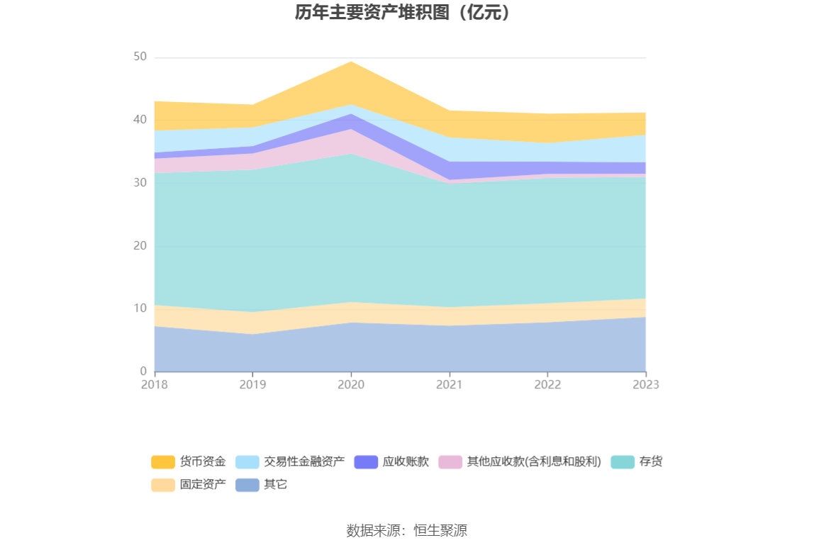 资产重大变化方面,截至2023年年末,公司交易性金融资产较上年末增加46.44%,占公司总资产比重上升3.28个百分点;货币资金较上年末减少23.42%,占公司总资产比重下降2.70个百分点;存货较上年末减少3.17%,占公司总资产比重下降1.76个百分点;预付款项较上年末增加37.39%,占公司总资产比重上升1.03个百分点。
