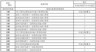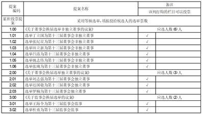 4、以上议案均采用累积投票制进行表决,其中,选举非独立董事应选人数为6人,选举独立董事应选人数为3人,选举监事应选人数为2人。股东所拥有的选举票数为其所持有表决权的股份数量乘以应选人数,可以将所拥有的选举票数以应选人数为限在候选人中任意分配(可以投出零票),但总数不得超过其拥有的选举票数。