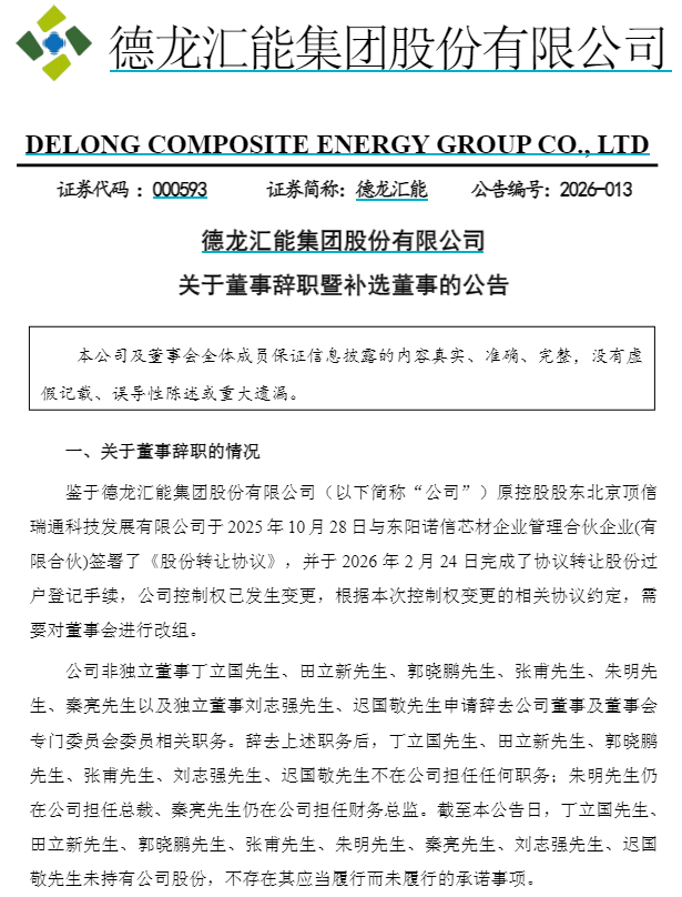 德龙汇能表示,鉴于公司原控股股东北京顶信瑞通科技发展有限公司于2025年10月28日与东阳诺信芯材企业管理合伙企业(有限合伙)签署《股份转让协议》,并于2月24日完成协议转让股份过户登记手续,公司控制权已发生变更,根据本次控制权变更的相关协议约定,需要对董事会进行改组。