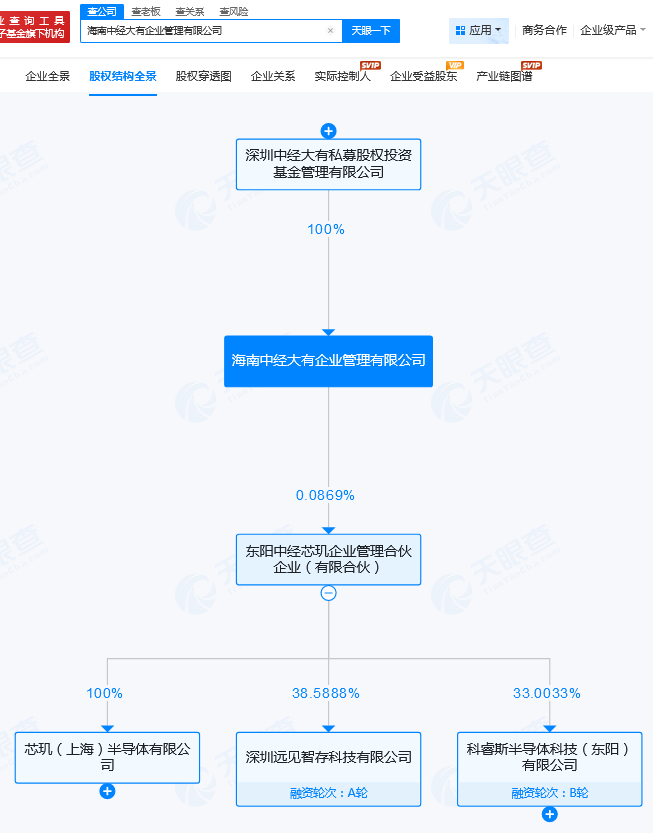 天眼查截图天眼查显示,孙维佳为深圳中经大有私募股权投资基金管理有限公司的法定代表人,该公司的全资子公司海南中经大有企业管理有限公司,系科睿斯半导体第一大股东东阳中经芯玑的执行事务合伙人。(中新经纬APP)