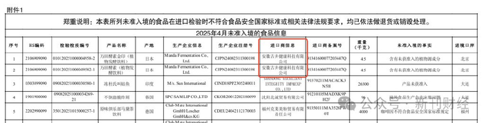 2025年6月5日,半岛网报道显示,古井贡酒(000596.SZ)旗下子公司安徽古井健康科技有限公司(以下简称:古井健康)从日本进口的两款酵素产品未准入境。5月22日,中国海关总署发布了2025年04月全国未准入境食品信息,内容显示,古井健康进口的“万田酵素金印”和“万田酵素”(生产企业:日本万田发酵株式会社Manda Fermentation Co.,Ltd.)因含有我国未批准使用的植物源成分,未能通过入境检验。