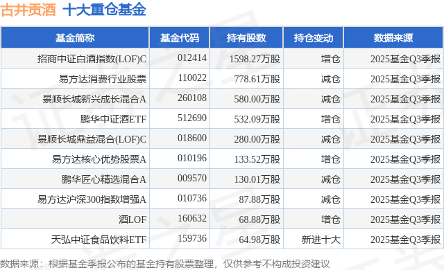 根据2025基金Q3季报公募基金重仓股数据,重仓该股的公募基金共51家,其中持有数量最多的公募基金为招商基金的招商中证白酒指数(LOF)C。招商中证白酒指数(LOF)C目前规模为150.16亿元,最新净值0.7652(11月7日),较上一交易日下跌0.31%,近一年下跌18.24%。该公募基金现任基金经理为侯昊。侯昊在任的基金产品包括:招商大宗商品(LOF),管理时间为2017年9月5日至今,期间收益率为66.47%;招商中证银行指数A,管理时间为2017年9月5日至今,期间收益率为80.65%;招商深证100指数A,管理时间为2017年9月5日至今,期间收益率为71.82%;招商央视财经50指数A,管理时间为2017年9月5日至今,期间收益率为79.29%。