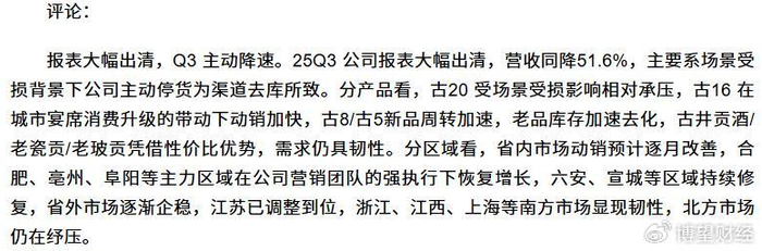 2025年三季度,古井贡酒面临渠道库存高企的压力,选择主动控制发货节奏,协助经销商去库存。这种“以空间换时间”的策略,导致古井贡酒单季营收同比腰斩,净利润大幅下滑74.56%。
