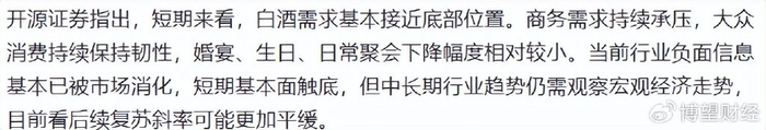 白酒行业正经历一轮罕见的系统性降温。开源证券指出,短期来看,白酒需求基本接近底部位置。当前行业负面信息基本已被市场消化,短期基本面触底,但中长期行业趋势仍需观察宏观经济走势,后续复苏斜率可能更加平缓。