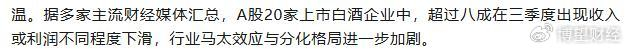 A股20家上市白酒企业中,超过八成在三季度出现收入或利润不同程度下滑。商务需求持续承压,大众消费保持一定韧性,婚宴、生日、日常聚会下降幅度相对较小。