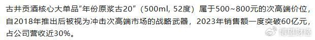 据《快消前瞻》报道,古井贡酒核心大单品“年份原浆古20”属于500-800元的次高端价位,自2018年推出后被视为冲击次高端市场的战略武器,2023年销售额一度突破60亿元,占其营收近30%。
