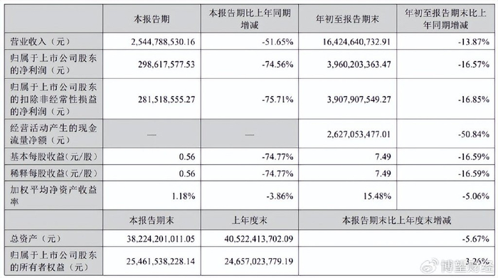 据财报显示,第三季度古井贡酒实现营业收入25.45亿元,同比暴跌51.65%;归母净利润2.99亿元,同比下降74.56%,创下2018年以来的最大单季跌幅。