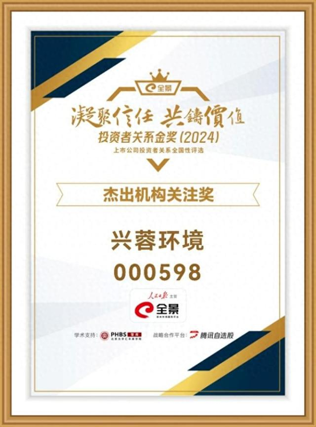 10月10日,兴蓉环境(000598)传来喜讯,公司在由人民日报主管的全景投资者关系金奖评选中,成功斩获“杰出机构关注奖”。这一荣誉不仅是资本市场对兴蓉环境投资者关系管理(IR)工作专业性的高度认可,更凸显了其以科学有效的IR作为市值管理核心手段之一,在提升市场认可度、优化资本运作效率方面的显著成效。